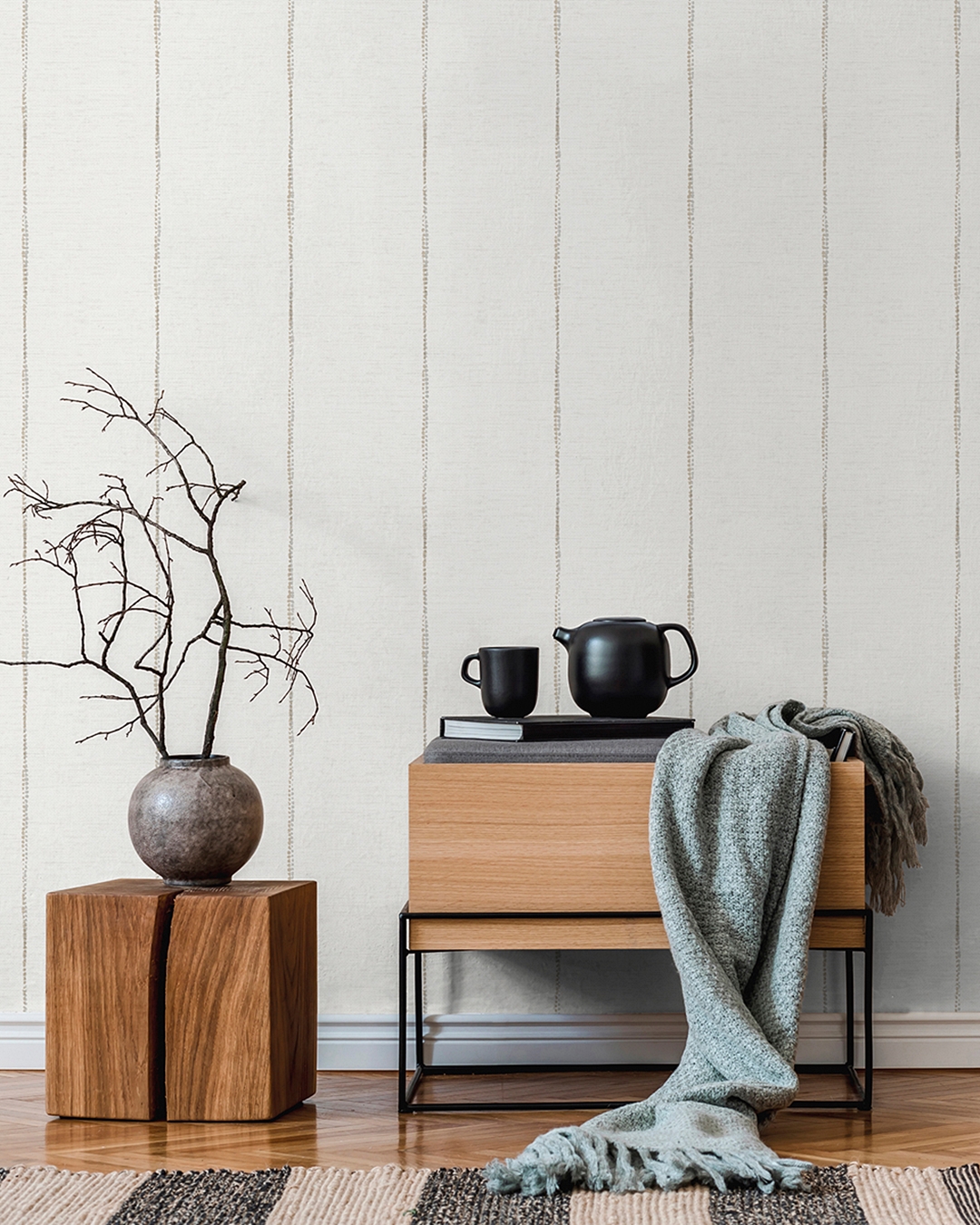 Inspirado en el lino natural y trabajado con un patrón de puntos sutiles, este diseño propone una raya vertical suave, apenas desdibujada, que aporta orden y serenidad. Perfecto para ambientes donde se busca una base decorativa elegante, sin robar protagonismo al mobiliario.