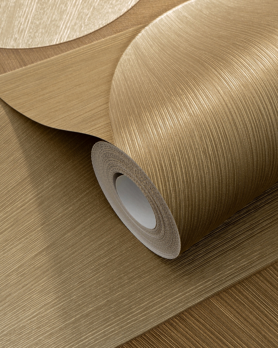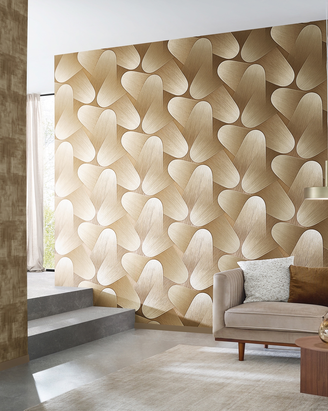 Grandes formas curvadas y pátinas metalizadas con reminiscencias de acero o latón cepillado definen un papel de vocación art déco contemporánea. Ideal como pared protagonista en salones y halls, combina muy bien con lisos neutros y detalles dorados.