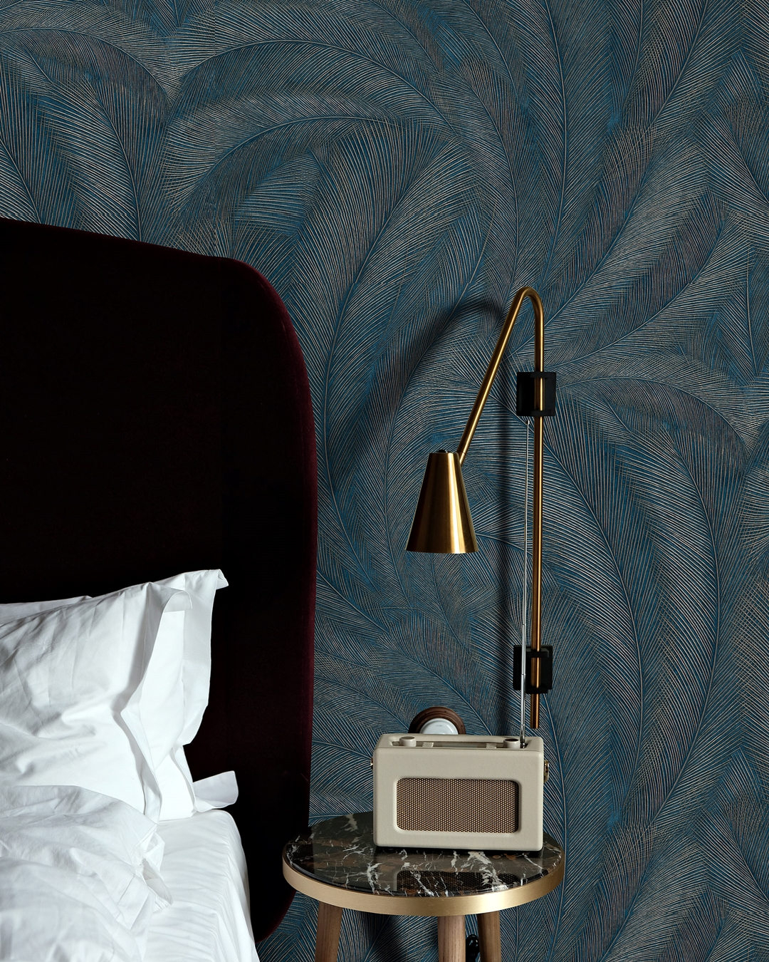 Patrón lineal inspirado en plumas, con reflejos metalizados que aportan dinamismo. El azul petróleo crea una atmósfera envolvente y sofisticada en salones, despachos o como cabecero. Funciona de maravilla con lisos azules, grises y dorados.