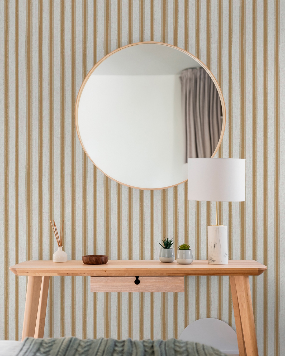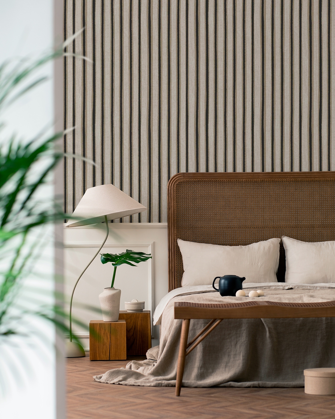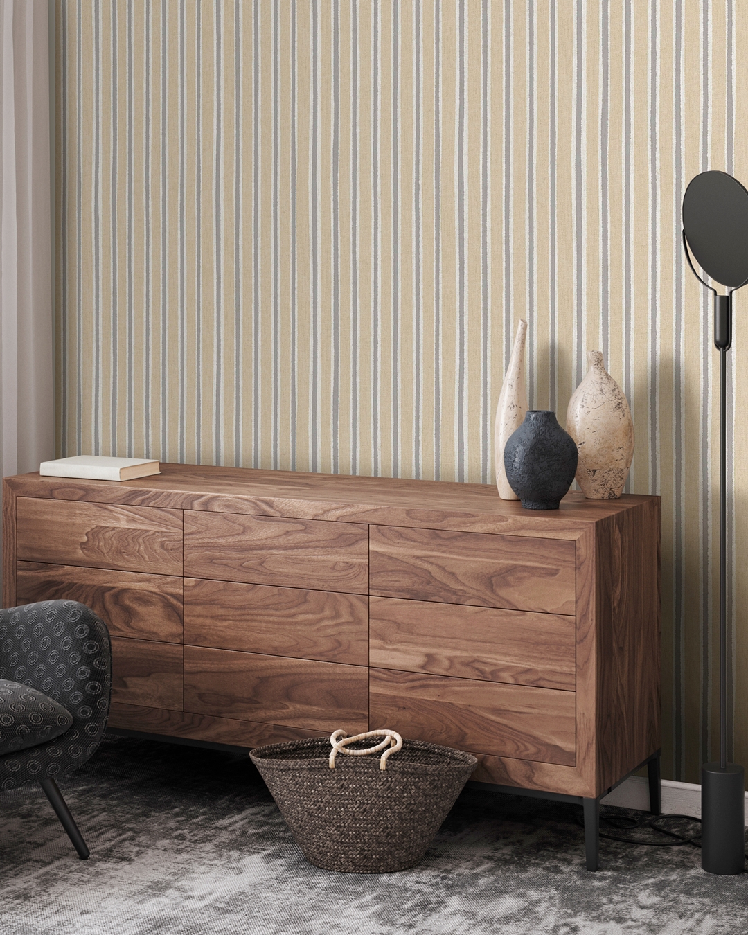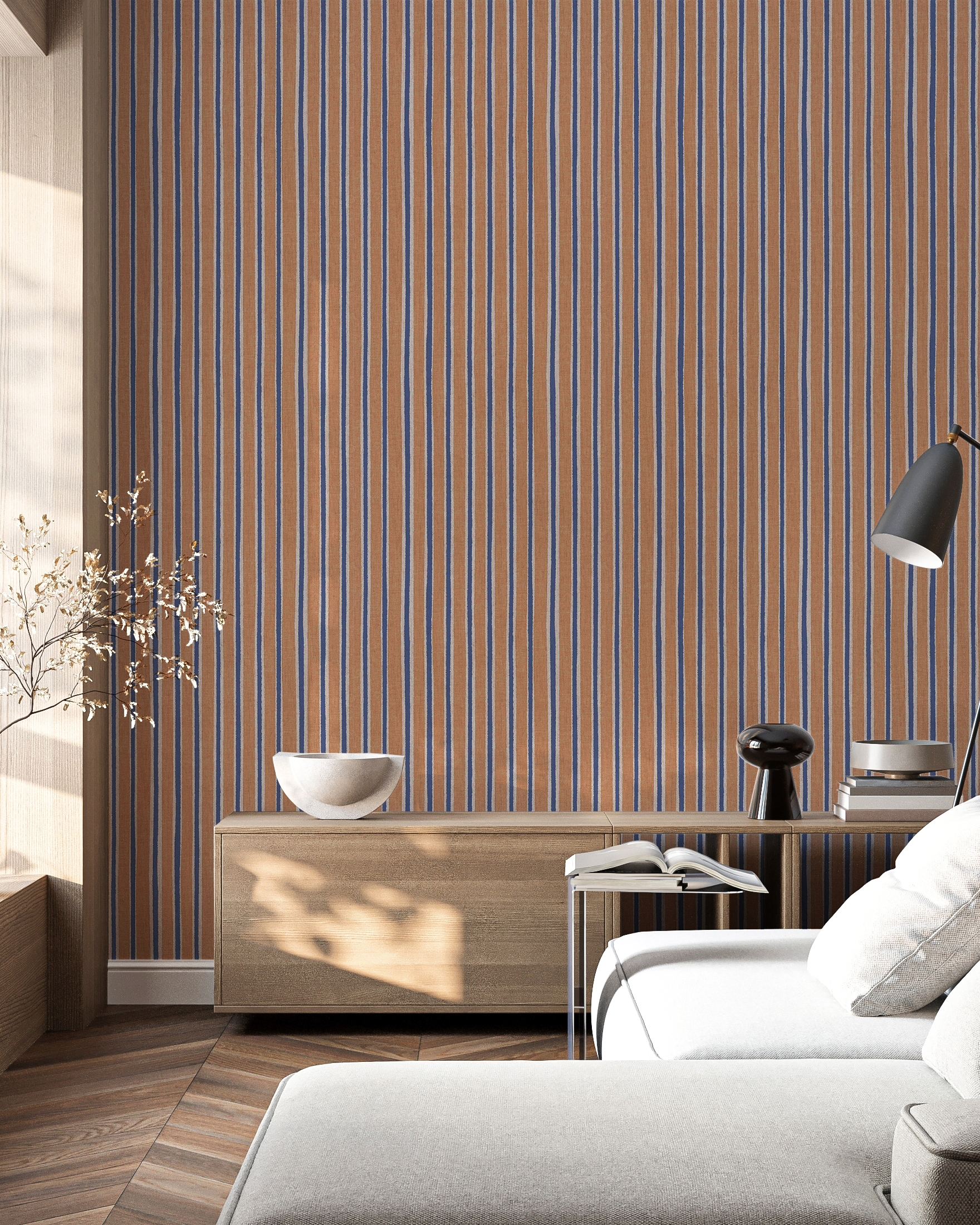Con sus rayas irregulares en tres colores y una textura que recuerda a la tela, Riga aporta dinamismo a las paredes y se convierte en una pieza clave para transformar salones, dormitorios o recibidores en espacios sofisticados y con personalidad.